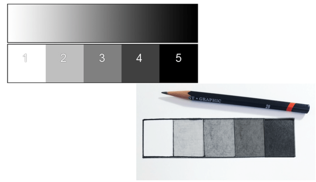 When introducing students to sketching with pencils, we don’t dive into full compositions right away. We begin with a simple and effective exercise: the 5-grid value scale.